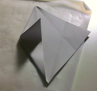 The sheet is folded from one corner to the opposite corner, creased, then opened back up. This gives you a nice line down the center in diagonal. Bring one corner to that middle crease, line up the edge and crease. Repeat on the opposite side. This will give you a nice point.